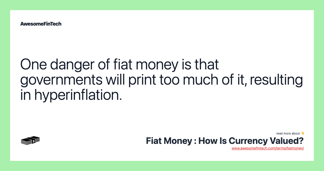 Because fiat money is not linked to physical reserves, such as a national stockpile of gold or silver, it risks losing value due to inflation or even becoming worthless in the event of hyperinflation. In some of the worst cases of hyperinflation, such as in Hungary immediately after WWII, the rate of inflation can double in a single day.