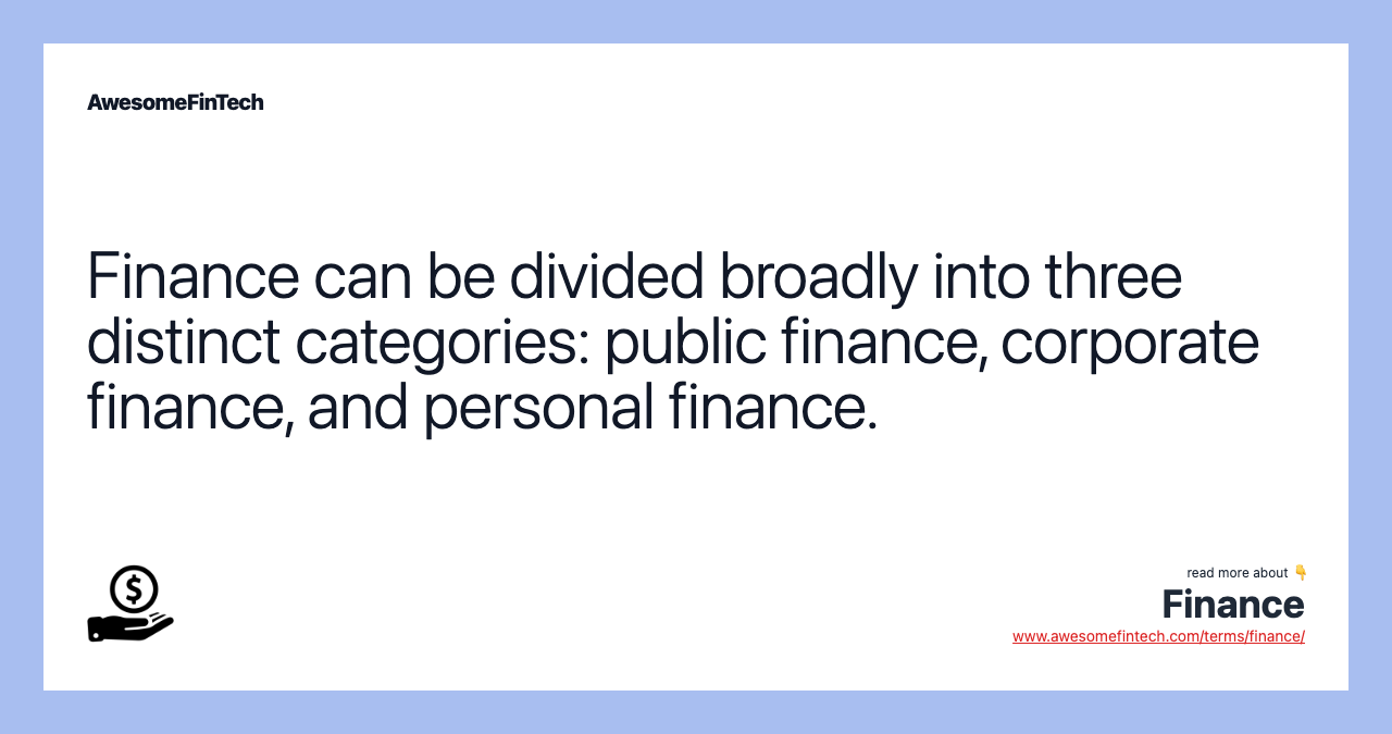Table of Contents What Is Finance? Understanding Finance History of Finance Public Finance Corporate Finance Personal Finance Social Finance Behavioral Finance Finance vs. Economics Is Finance an Art or a Science? The Corporate Finance Institute (CFI), a provider of online modeling courses and certification programs, identifies these categories as the most popular for career paths within the finance industry: Commercial banking Personal banking (or private banking) Investment banking Wealth management Corporate finance Mortgages / lending Financial planning Equity research Finance is a broad term that describes activities associated with banking, leverage or debt, credit, capital markets, funds, and investments. Table of Contents What Is Finance? Understanding Finance History of Finance Public Finance Corporate Finance Personal Finance Social Finance Behavioral Finance Finance vs. Economics Is Finance an Art or a Science? Behavioral science is the field that was born out of these efforts; it seeks to explain our actions, whereas modern finance seeks to explain the actions of the idealized “economic man” (Homo economicus). Behavioral finance, a sub-field of behavioral economics, proposes psychology-based theories to explain financial anomalies, such as severe rises or falls in stock price. Finance can be divided broadly into three distinct categories: public finance, corporate finance, and personal finance.