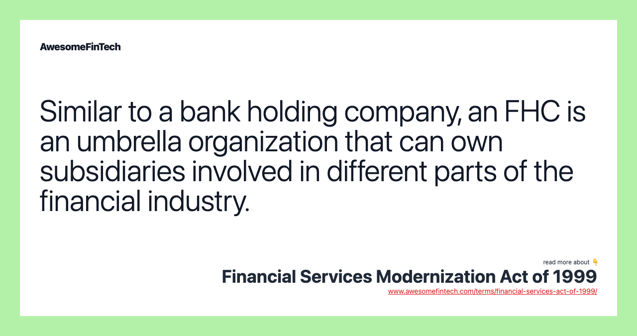 The Financial Services Modernization Act of 1999 is a law that serves to partially deregulate the financial industry. This legislation is also known as the Gramm-Leach-Bliley Act, the law was enacted in 1999 and removed some of the last restrictions of the Glass-Steagall Act of 1933. When the financial industry began to struggle during economic downturns, supporters of deregulation argued that if allowed to collaborate, companies could establish divisions that would be profitable when their main operations suffered slowdowns. By eliminating the prohibition against the consolidation of deposit banking and investment banking, enacted under Glass-Steagall, the Gramm-Leach-Bliley Act directly exposed traditional deposit banking to the risky and speculative practices of investment banks and other securities firms. A structure needed to exist to house these new subsidiaries, which led to the creation of the financial holding company (FHC). Similar to a bank holding company, an FHC is an umbrella organization that can own subsidiaries involved in different parts of the financial industry. The Financial Services Modernization Act — or the Gramm-Leach-Bliley Act — is a law passed in 1999 that partially deregulates the financial industry.