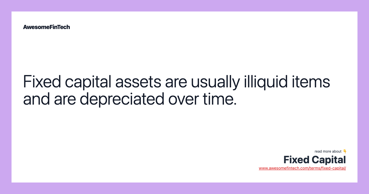 Fixed capital is the portion of total capital outlay of a business invested in physical assets such as factories, vehicles, and machinery that stay in the business almost permanently, or, more technically, for more than one accounting period. Fixed assets can be purchased and owned by a business, or they can be structured as a long-term lease.