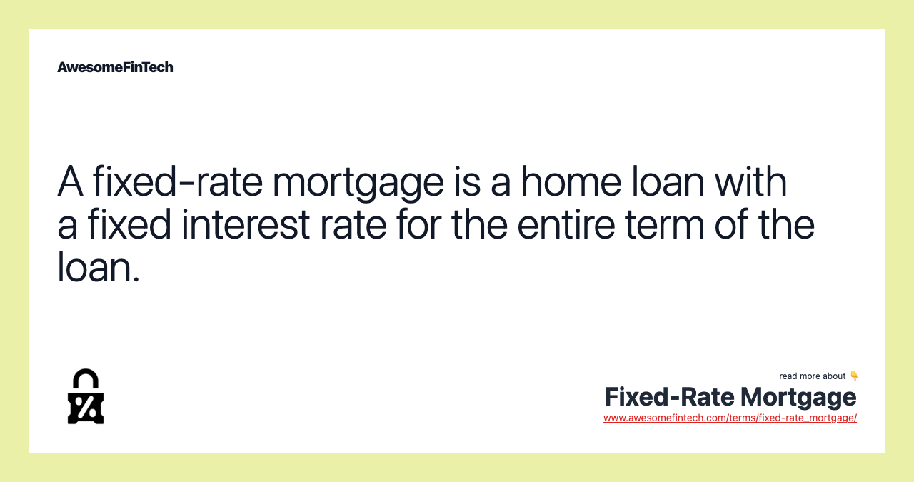The term “fixed-rate mortgage” refers to a home loan that has a fixed interest rate for the entire term of the loan. This means that the mortgage carries a constant interest rate from beginning to end. Fixed-rate mortgages are popular products for consumers who want to know how much they’ll pay every month.