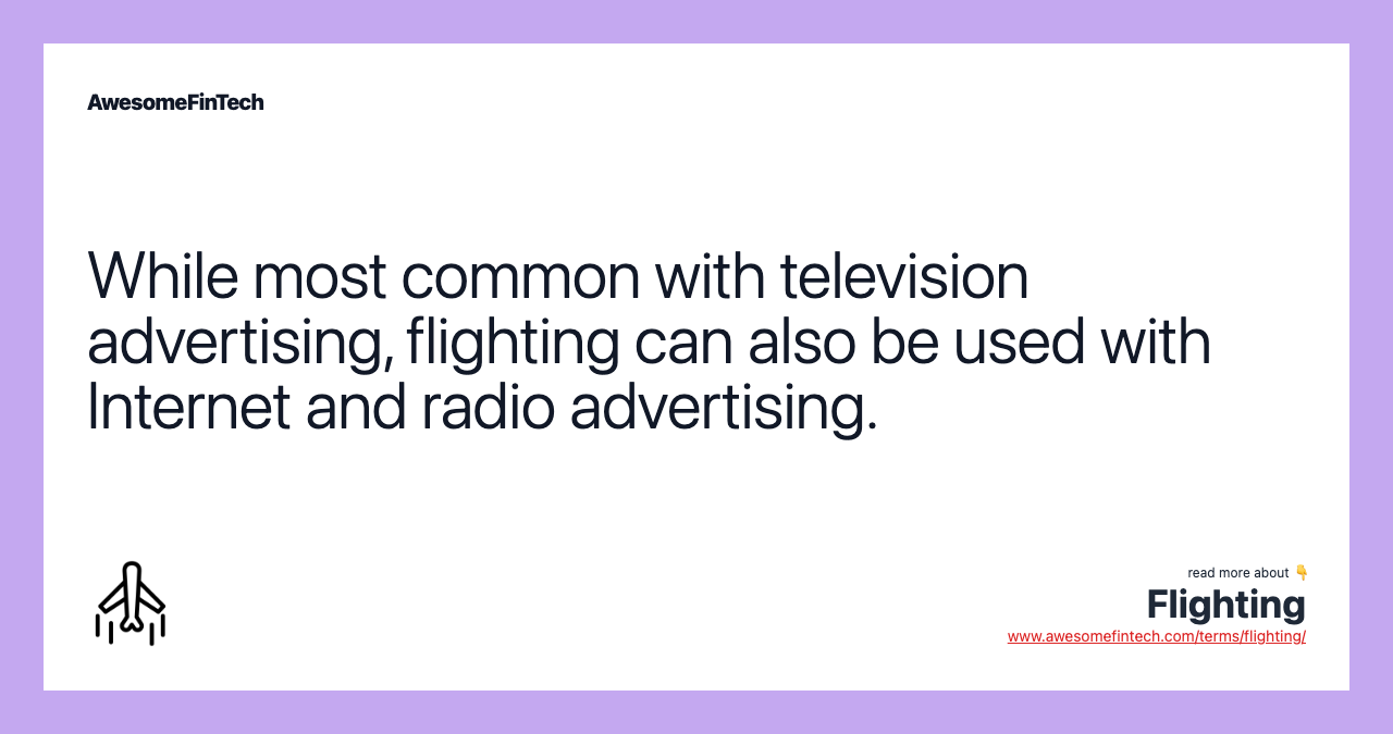 Flighting is an advertising scheduling strategy that alternates between running a normal schedule of advertising and a complete cessation of all runs. Flighting is an advertising scheduling strategy that alternates between running a normal schedule of advertising and a complete cessation of all runs. Marketing companies and advertising agencies utilize internal and paid-for research to formulate the right advertising strategy, one that yields the best results while also expending no more resources than necessary. While flighting can be defined as a binary on/off scheduling of ad runs based on seasonality, pulsing involves continuous advertising that also features a number of intermittent, planned spikes in ad runs that are not based on seasonality. Flighting is an advertising scheduling strategy that can be turned on and off to save money and optimize for a product or service's most marketable time windows.