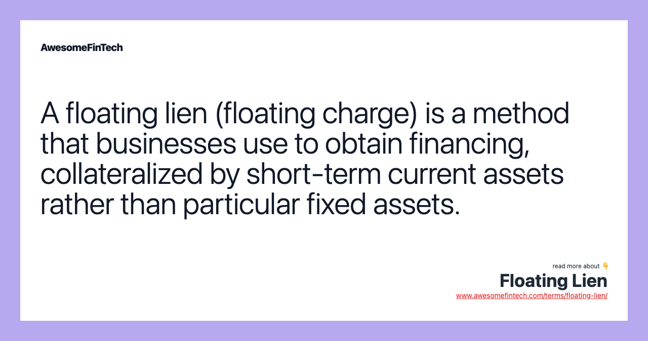 A floating lien, also known as a floating charge, is a way for a company to obtain a loan using a security interest in a general set of assets, in which the individual assets are not specifically identified, as collateral. Typically, a loan would be secured by fixed assets such as property or equipment, but with a floating lien, the underlying assets are usually current assets or short-term assets that can change in value. A floating lien (floating charge) is a method that businesses use to obtain financing, collateralized by short-term current assets rather than particular fixed assets. A floating lien, also known as a floating charge, is a way for a company to obtain a loan using a security interest in a general set of assets, in which the individual assets are not specifically identified, as collateral. The floating charge is secured by the current assets while allowing the company to use those assets to run its business operations.