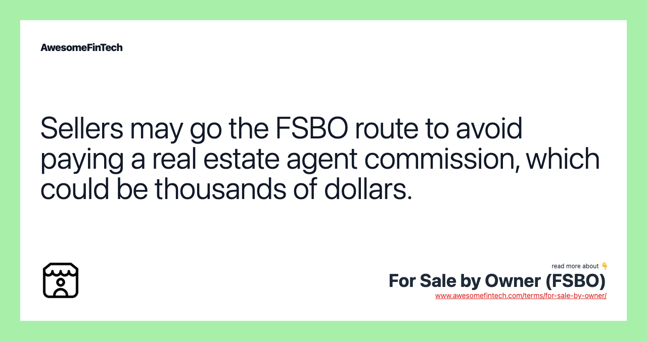 For sale by owner (FSBO) is a term that refers to a method of listing a property for sale. When a house has an FSBO listing, it means the owner is selling the property without the help of a listing agent or broker. One reason sellers choose this option is to avoid paying the real estate agent a commission on the sale.