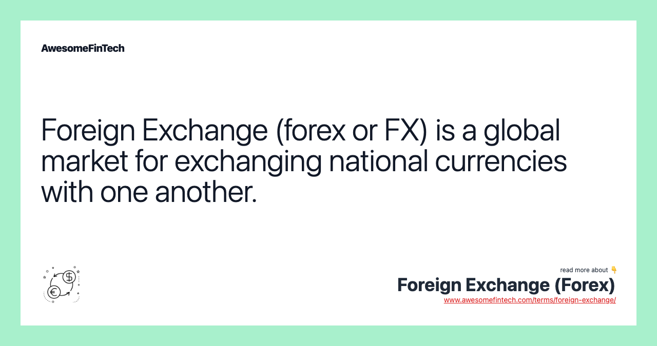 Foreign Exchange (forex or FX) is the trading of one currency for another. For example, one can swap the U.S. dollar for the euro. Foreign exchange transactions can take place on the foreign exchange market, also known as the forex market.