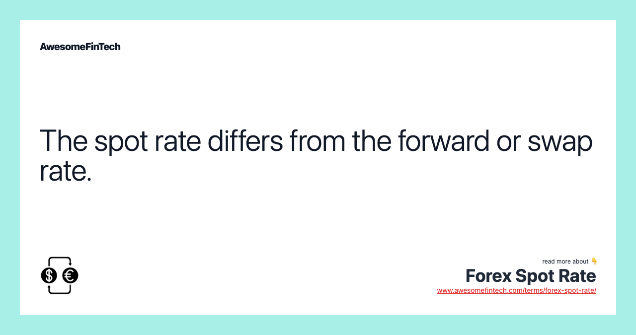 Table of Contents What Is the Forex Spot Rate? Because the spot rate is the rate of delivery with no adjustment for interest rate differential, it is the rate quoted in the retail market. The spot forex rate differs from the forward rate in that it prices the value of currencies compared to foreign currencies today, rather than at some time in the future. Contrary to a spot rate, a forward rate is used to quote a financial transaction that takes place on a future date and is the settlement price of a forward contract. The forex spot rate is the current exchange rate at which a currency pair can be bought or sold.
