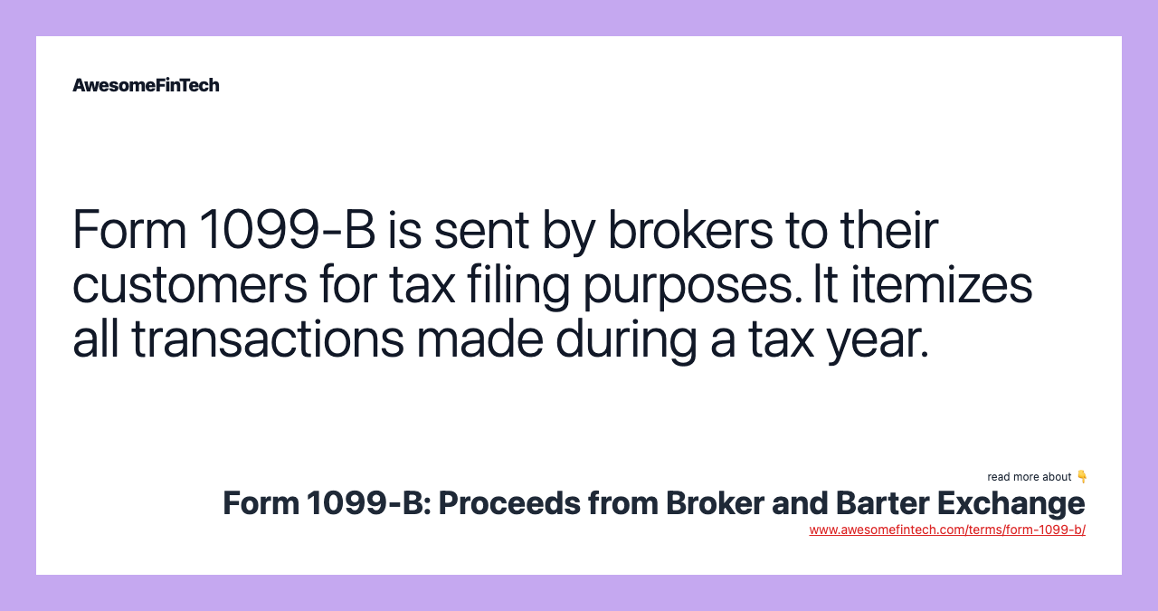 A 1099-B is the tax form that individuals receive from their brokers listing their gains and losses from transactions made throughout the tax year. read more