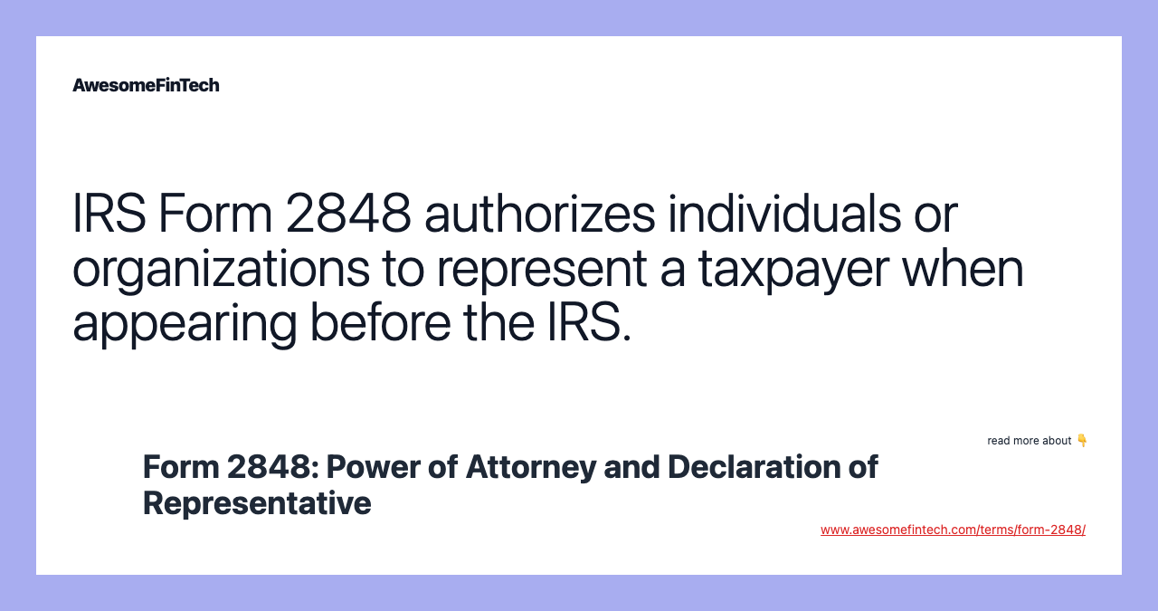 Form 2848: Power of Attorney and Declaration of Representative is an Internal Revenue Service (IRS) document that authorizes an individual or organization to represent a taxpayer by appearing before the IRS — at an audit, for example.