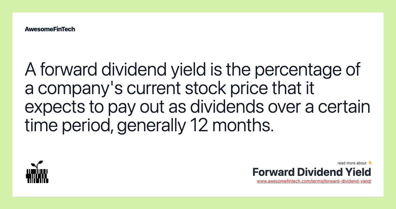 A forward dividend yield is an estimation of a year's dividend expressed as a percentage of the current stock price. The year's projected dividend is measured by taking a stock's most recent actual dividend payment and annualizing it. The forward dividend yield is calculated by dividing a year's worth of future dividend payments by a stock's current share price.