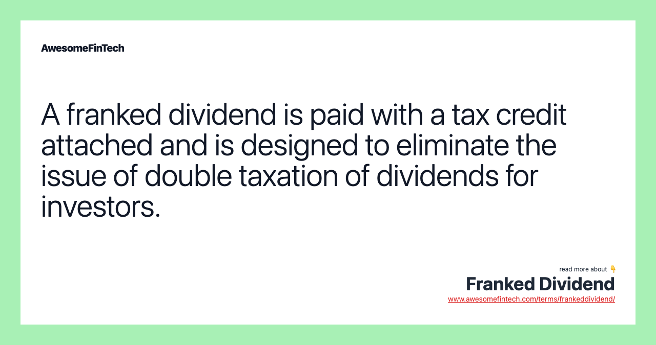 A franked dividend is paid with a tax credit attached and is designed to eliminate the issue of double taxation of dividends for investors. Basically, it reduces a dividend-receiving investor's tax burden.