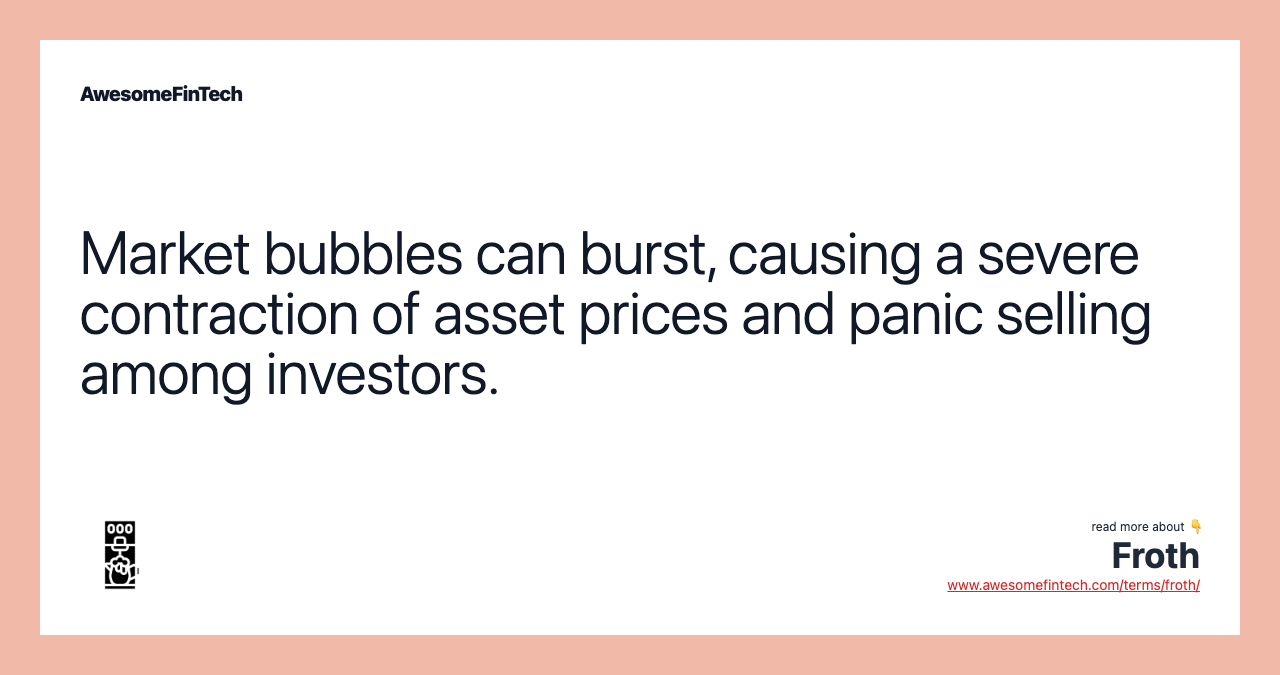 Froth and "frothiness" are Wall Street's way of indicating the price of a particular asset is on its way to becoming unsustainably high. Market froth marks the beginning of asset price inflation that the market will likely not be able to support in the future. A frothy market can be the precursor to a market bubble, which may lead to a severe contraction of asset prices, also known as a crash or burst bubble.