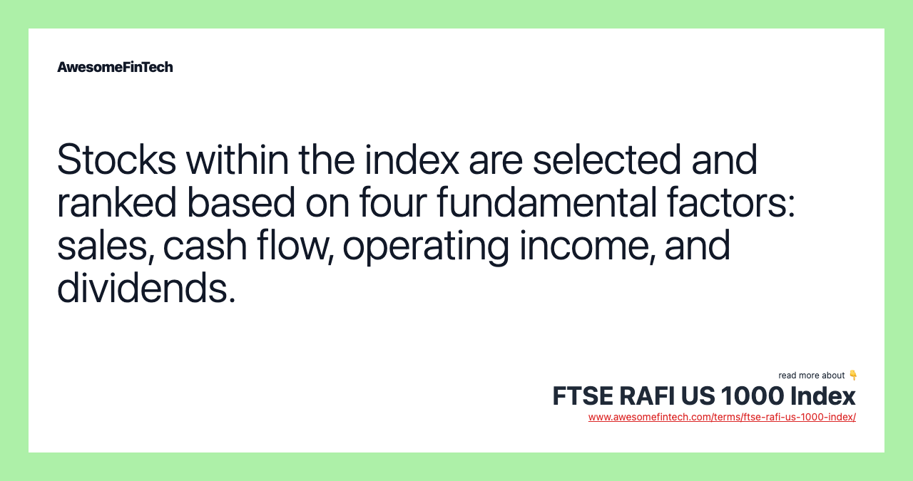 The FTSE RAFI U.S. 1000 Index is a benchmark for the share prices of the largest 1,000 companies in the United States ranked according to certain fundamentals. The four fundamental factors are dividends, book value, sales, and cash flow.