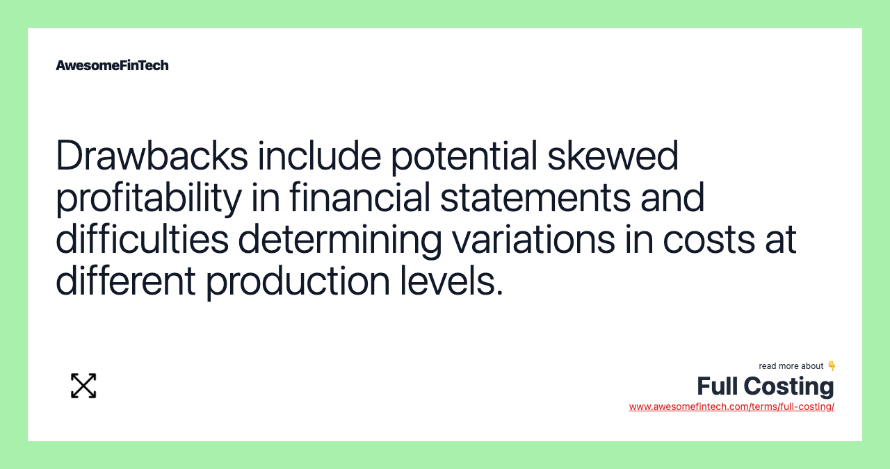 Difficult to Compare Product Lines: Full costing also has several drawbacks. For example, taking into account all expenses, including those not directly associated with production, may make it slightly harder for management to compare the profitability of different product lines.
