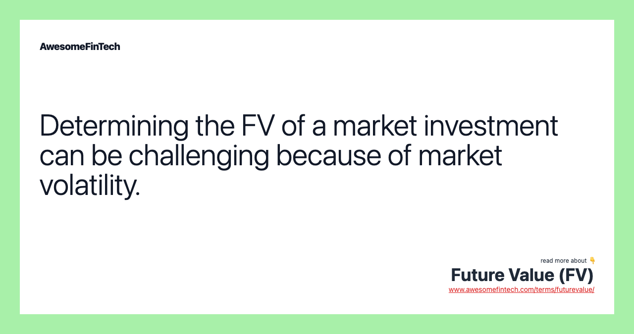 Determining the FV of an asset can become complicated, depending on the type of asset. Also, the FV calculation is based on the assumption of a stable growth rate. If money is placed in a savings account with a guaranteed interest rate, then the FV is easy to determine accurately. However, investments in the stock market or other securities with a more volatile rate of return can present greater difficulty.