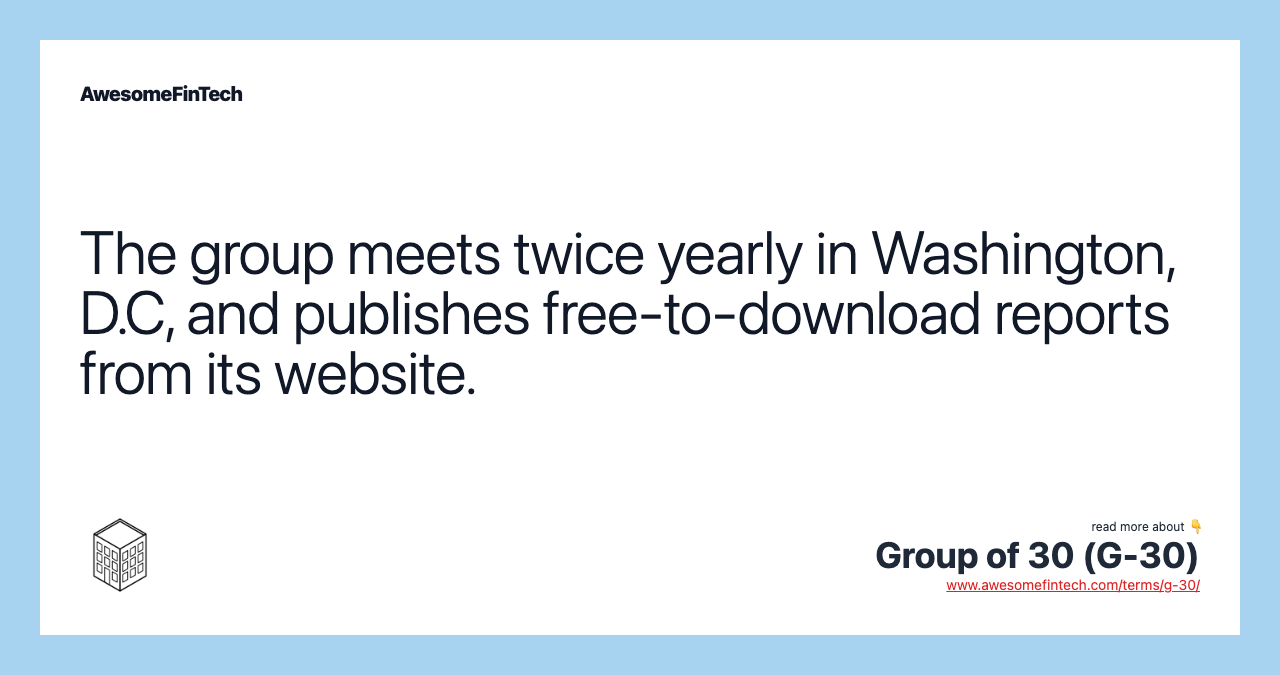 The Group of 30, generally abbreviated to G-30, is a private, nonprofit international body composed of academic economists, company chiefs, and representatives of national, regional, and central banks. G-30 members meet twice a year to discuss and better undersand financial and economic issues in the private and public sectors worldwide.