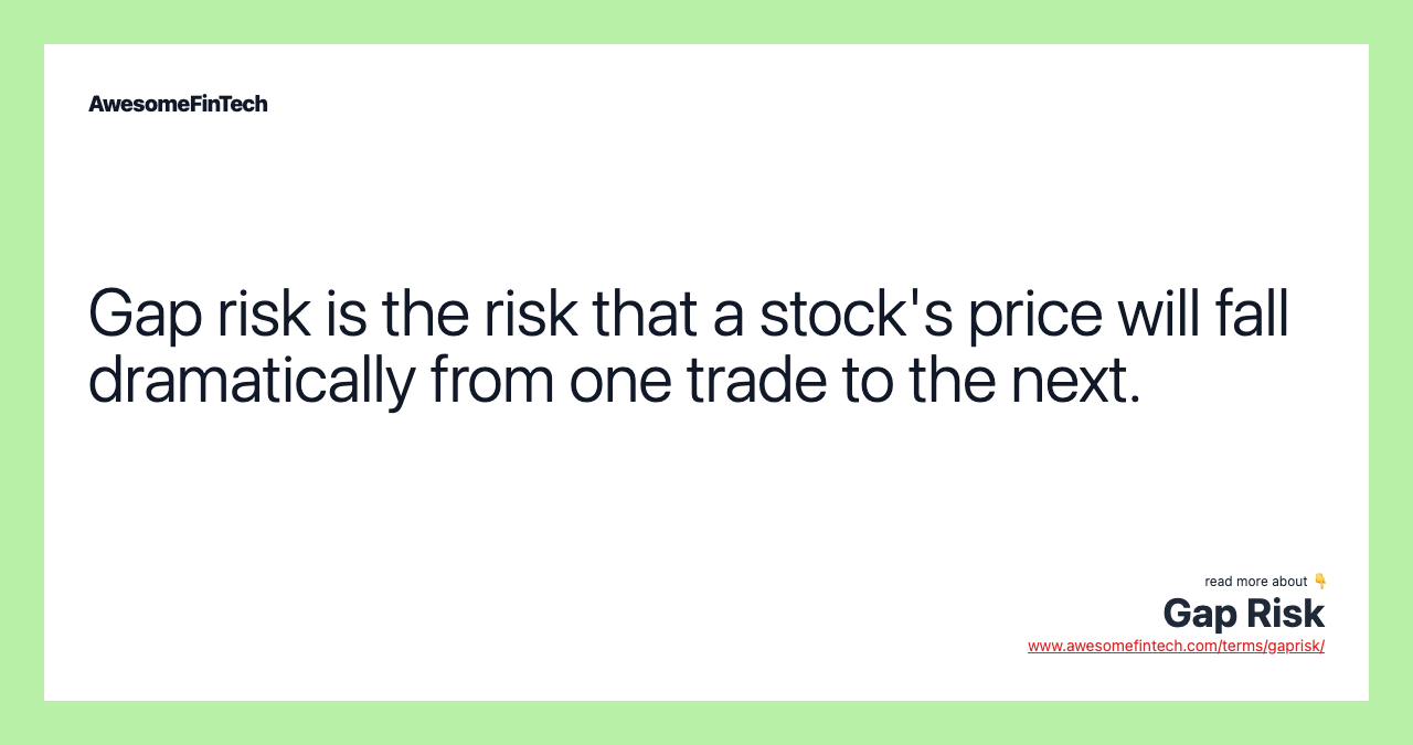 Gap risk is the risk that a stock's price will fall dramatically from one trade to the next. A gap occurs when a security’s price changes from one level to another (up or down) without any trading in between. Usually, such movements occur when there are adverse news announcements made about the company, which can cause a stock price to drop substantially from the previous day's closing price.