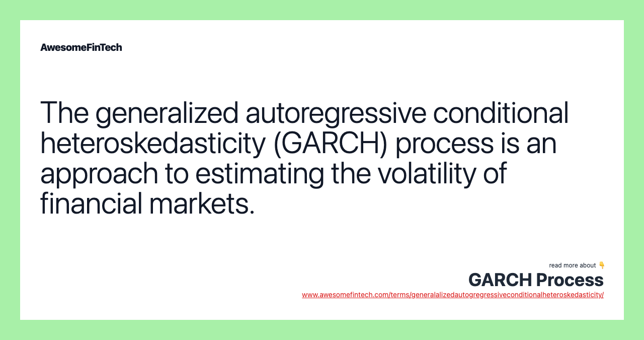 The generalized autoregressive conditional heteroskedasticity (GARCH) process is an econometric term developed in 1982 by Robert F. Engle, an economist and 2003 winner of the Nobel Memorial Prize for Economics. GARCH describes an approach to estimate volatility in financial markets.