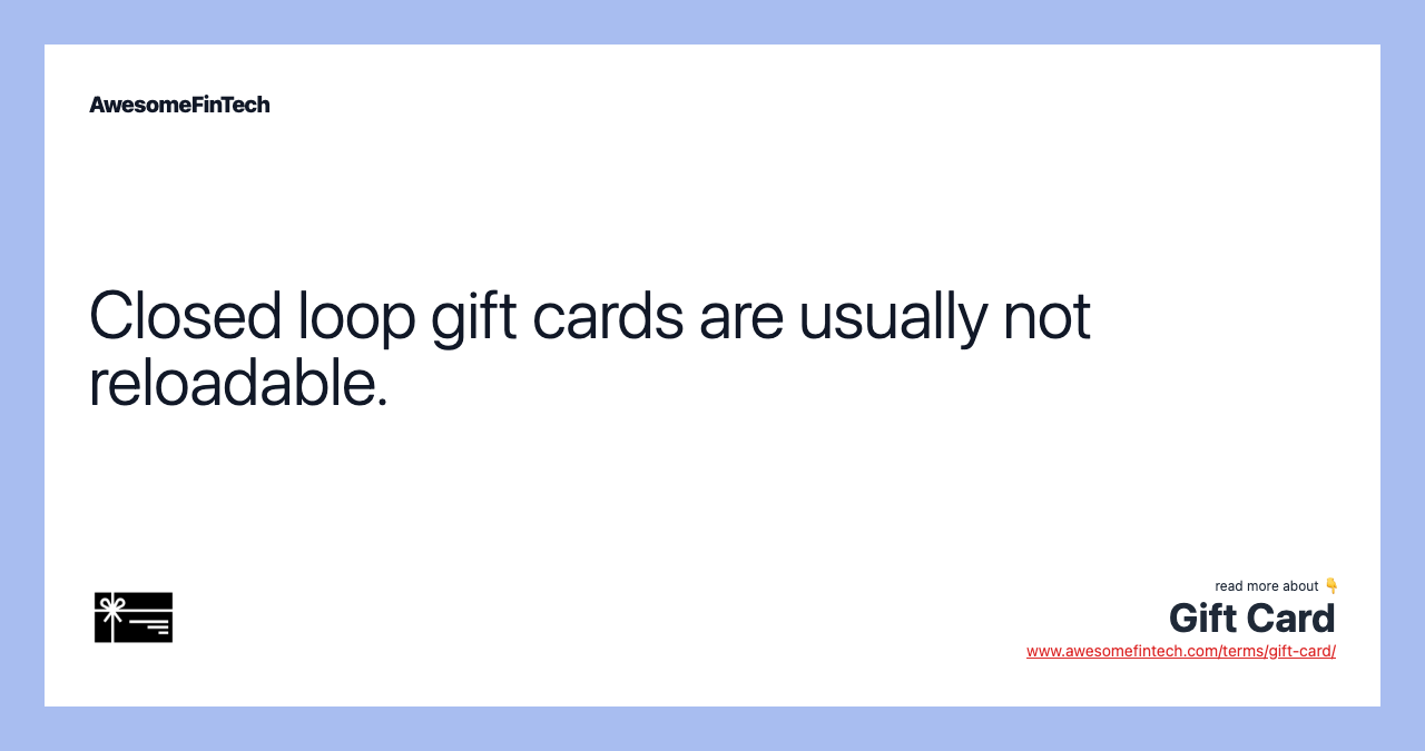Closed loop gift cards are usually not reloadable, so once the balance is spent, they have no further use. Funds on a closed loop gift card may also have a specified expiration date, which requires the user to use the card within a specific timeframe.