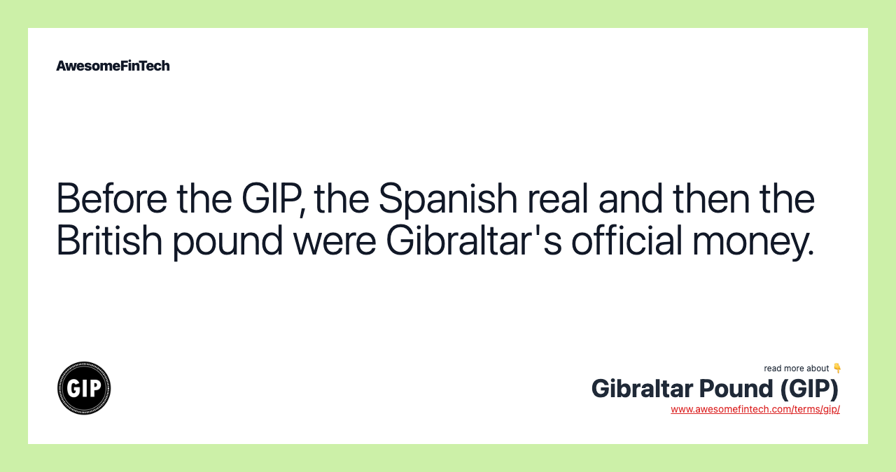 The Gibraltar pound (abbreviated as GIP) is the official currency for the country of Gibraltar. The Gibraltar pound is pegged at par value to the British pound sterling, at a fixed exchange rate.