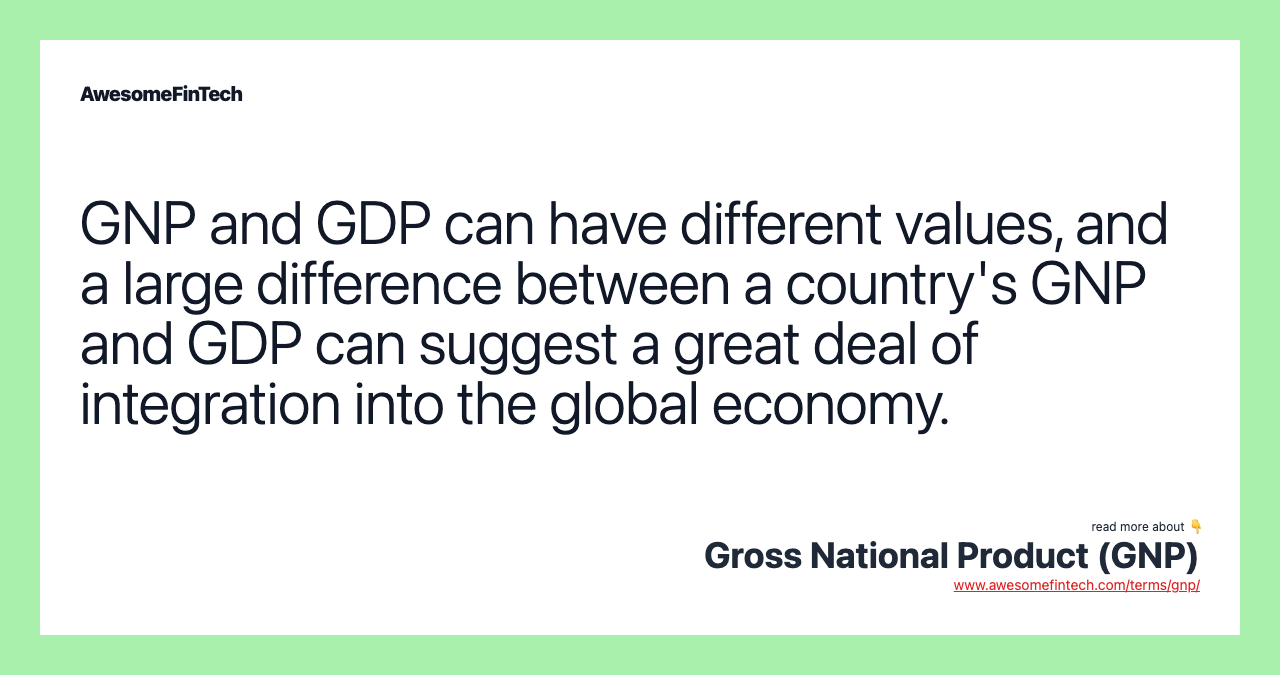 GNP is related to another important economic measure called gross domestic product (GDP), which takes into account all output produced within a country's borders regardless of who owns the means of production. GNP starts with GDP, adds residents' investment income from overseas investments, and subtracts foreign residents' investment income earned within a country. (For related reading, see "Understanding GDP vs. GNP")