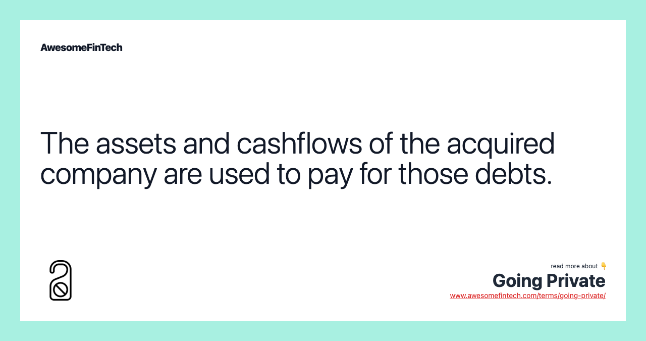 Many going private transactions involve significant amounts of debt. In these situations, the assets of the acquired company are used as collateral for the loans, and its cashflows are used to pay for debt servicing.