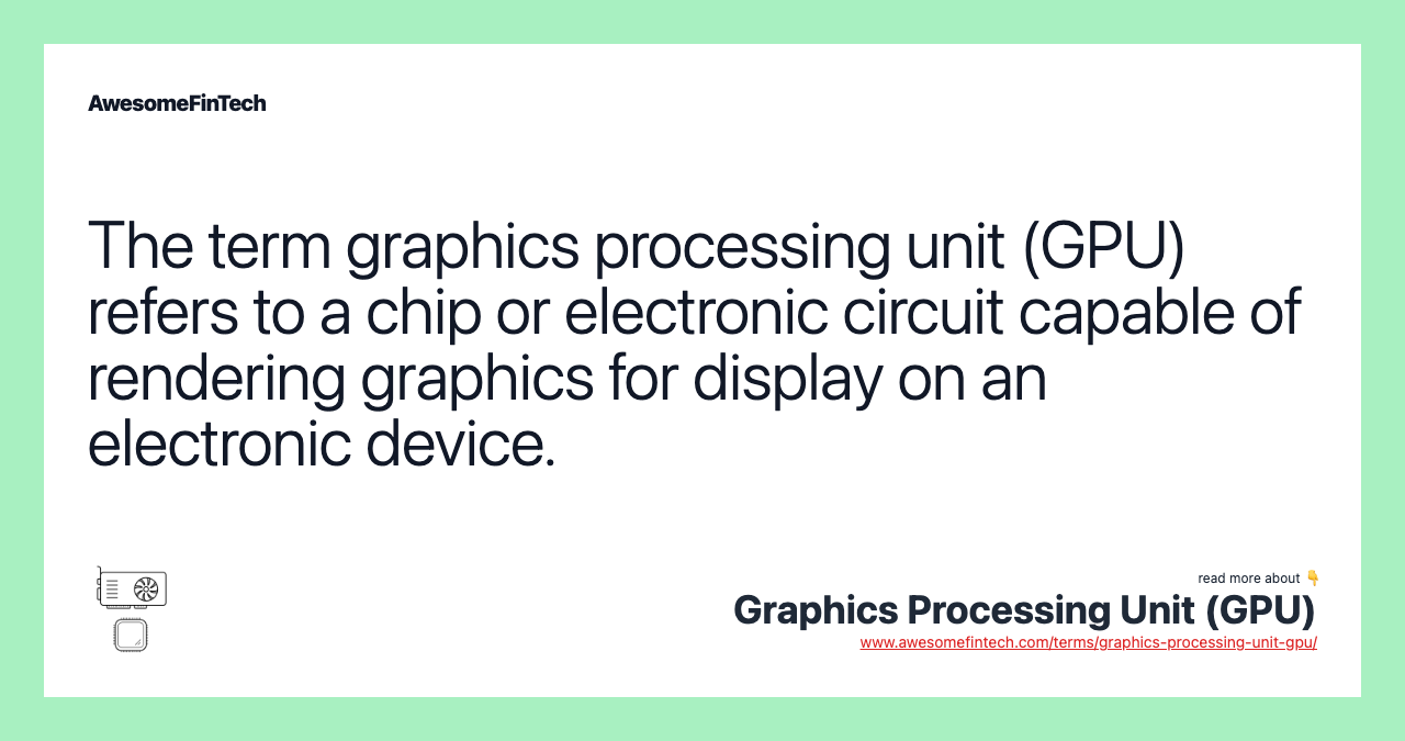 Table of Contents What Is a Graphics Processing Unit? This conversion requires the Graphics Processing Unit (GPU) to have a lot of processing power, which also makes GPUs useful in machine learning, artificial intelligence, and other tasks that require a large number of complex and sophisticated computations. In 1999, Nvidia introduced the Geforce 256, the first widely available GPU. Whereas GPU is a chip or electronic circuit capable used to render graphics for display on an electronic device, a VGA or video graphics array connector is a physical device used to transfer video signals and computer video output. The term graphics processing unit (GPU) refers to a chip or electronic circuit capable of rendering graphics for display on an electronic device. Today, most desktop computers typically use a separate graphics card with a GPU for increased performance, rather than rely on a GPU built into a motherboard.