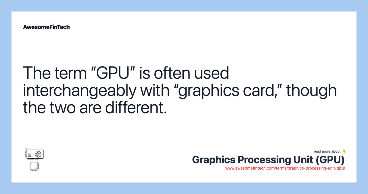 The term “GPU” is often used interchangeably with “graphics card,” though the two are different. A graphics card is a piece of hardware that contains one or more GPUs, a daughterboard, and other electronic components that allow the graphics card to function.