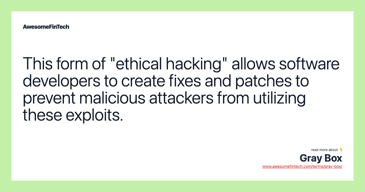 Gray box refers to the testing of software where there is some limited knowledge of its internal workings. Gray box testing is an ethical hacking technique where the hacker has to use limited information to identify the strengths and weaknesses of a target's security network.