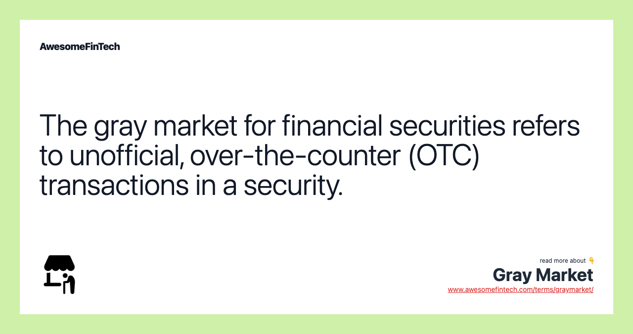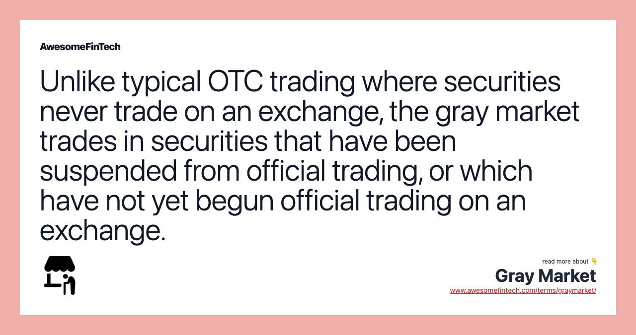 A gray market is an unofficial market for financial securities. Unlike typical OTC trading where securities never trade on an exchange, the gray market trades in securities that have been suspended from official trading, or which have not yet begun official trading on an exchange. Gray (or “grey”) market trading generally occurs when a stock that has been suspended from trades off the market, or when new securities are bought and sold before official trading begins. The gray market enables the issuer and underwriters to gauge demand for a new offering because it is a “when issued” market (i.e., it trades securities that will be offered in the very near future). A gray market is an unofficial market for financial securities.
