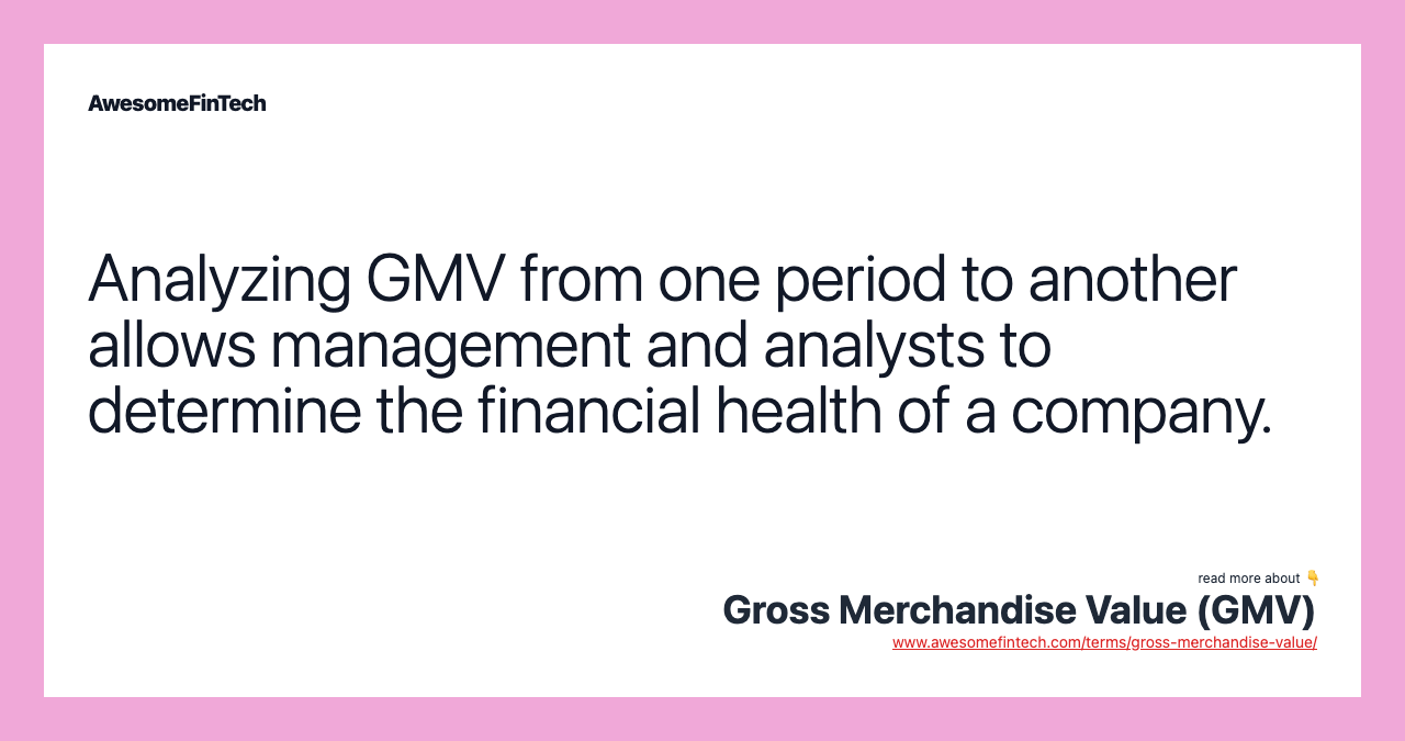 Gross merchandise value (GMV) is often used to determine the health of an e-commerce site's business because its revenue will be a function of gross merchandise sold and fees charged. It is most useful as a comparative measure over time, such as current quarter value versus previous quarter value.