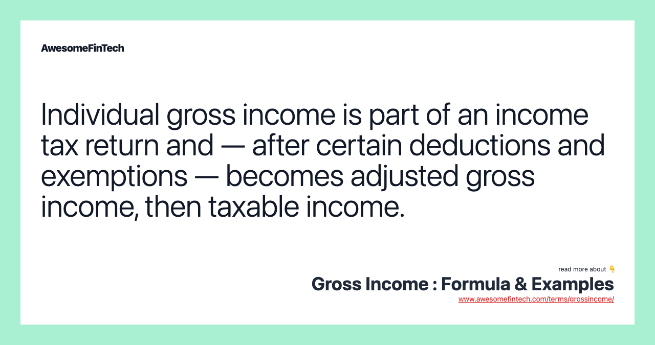 Gross income for an individual — also known as gross pay when it’s on a paycheck — is the individual’s total pay from their employer before taxes or other deductions. A company’s gross income, found on the income statement, is the revenue from all sources minus the firm’s cost of goods sold (COGS). Gross income for an individual consists of income from wages and salary plus other forms of income, including pensions, interest, dividends, and rental income. Gross income for a business, also known as gross profit or gross margin, includes the gross revenue of the firm less cost of goods sold, but it does not include all of the other costs involved in running the business. Individual gross income is part of an income tax return and — after certain deductions and exemptions — becomes adjusted gross income, then taxable income. There are income sources that are not included in gross income for tax purposes but still may be included when calculating gross income for a lender or creditor. For individuals, the gross income metric used on the income tax return includes not just wages or salary but also other forms of income, such as tips, capital gains, rental payments, dividends, alimony, pension, and interest.