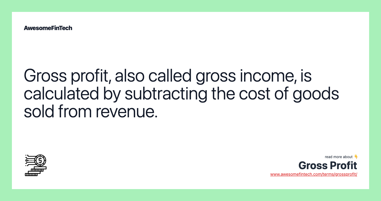Gross profit is the profit a company makes after deducting the costs associated with making and selling its products, or the costs associated with providing its services. Gross profit will appear on a company's income statement and can be calculated by subtracting the cost of goods sold (COGS) from revenue (sales). These figures can be found on a company's income statement. Gross profit may also be referred to as sales profit or gross income.