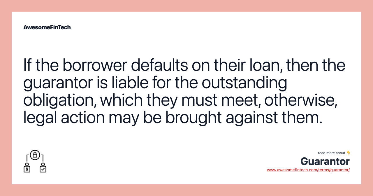 In the event a borrower defaults, the guarantor must meet the obligation. If they do not, they are still liable and can have a lawsuit brought against them for the outstanding amount. They will also see a negative hit on their credit score.