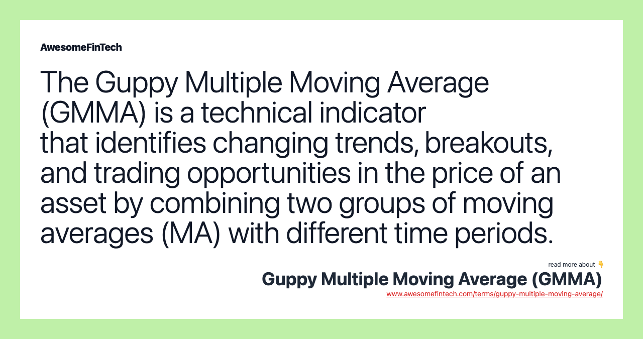 The Guppy Multiple Moving Average (GMMA) is a technical indicator that aims to anticipate a potential breakout in the price of an asset. The term gets its name from Daryl Guppy, an Australian financial columnist and book author who developed the concept in his book, "Trading Tactics."