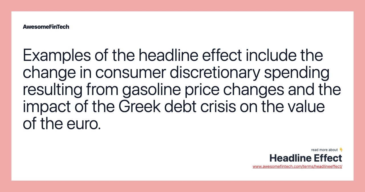 An example of a headline effect is the media's extensive coverage of the impact of rising gas prices on consumers. Some economists believe that the more attention that is paid to small increases in the price of gasoline, the more likely it is that consumers will be more cautious about spending their discretionary dollars. The headline effect can be regarded as the difference between decreases in discretionary spending that are rationally justifiable based on economic fundamentals and those that occur purely as a result of news coverage.