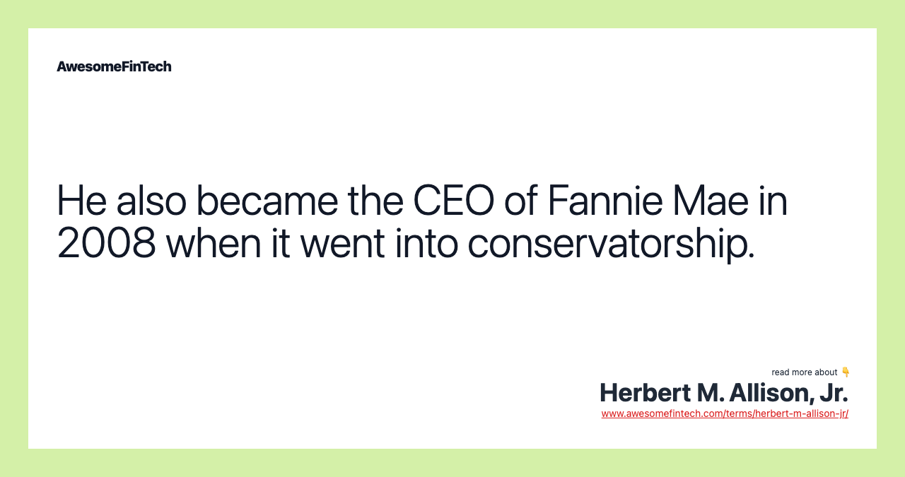 After Allison retired from TIAA-CREF in 2008, he was reportedly on vacation when he got the call from then-Treasury Secretary Hank Paulson to come to Washington DC. From there he took over as CEO of the distressed mortgage lender Fannie Mae. He famously only took a dollar per year as a salary.