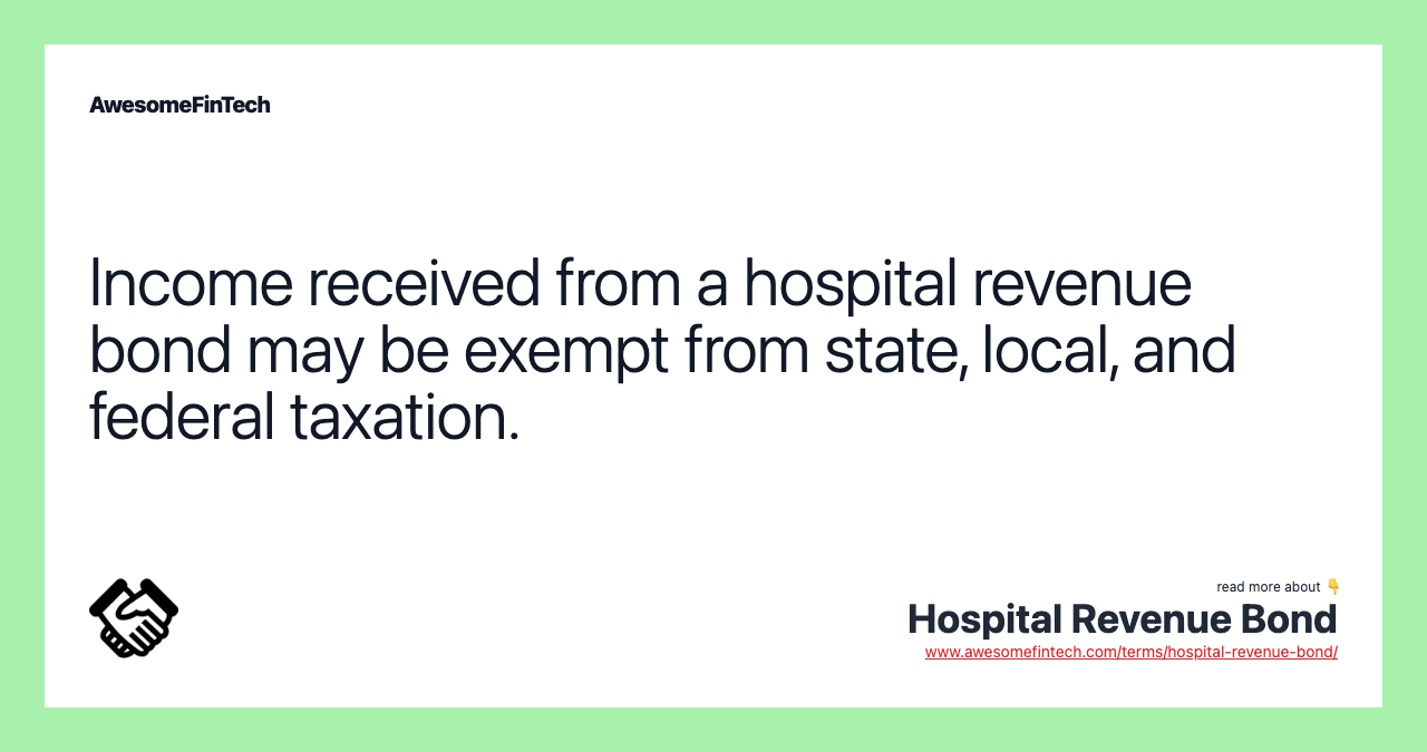 A hospital revenue bond is a type of municipal bond that finances the construction of new facilities or upgrades for existing hospitals and is secured by the revenues that hospitals receive in the course of their normal operations. A hospital revenue bond is a type of municipal bond that finances the construction of new facilities or upgrades for existing hospitals and is secured by the revenue that hospitals receive in the course of their normal operations. Hospital revenue bonds typically command higher yields due to their default risk being higher given their inability to raise revenue through taxes like other municipal bonds. Generally, bondholders receive payment only after paying the expenses of running the hospital is complete which can create risk for bondholders if the hospital is not as profitable as anticipated. Hospital revenue bonds are considered to be among the riskiest types of municipal bonds. A hospital revenue bond is a type of municipal bond that finances the construction of new facilities or upgrades for existing hospitals and is secured by the revenues that hospitals receive in the course of their normal operations.