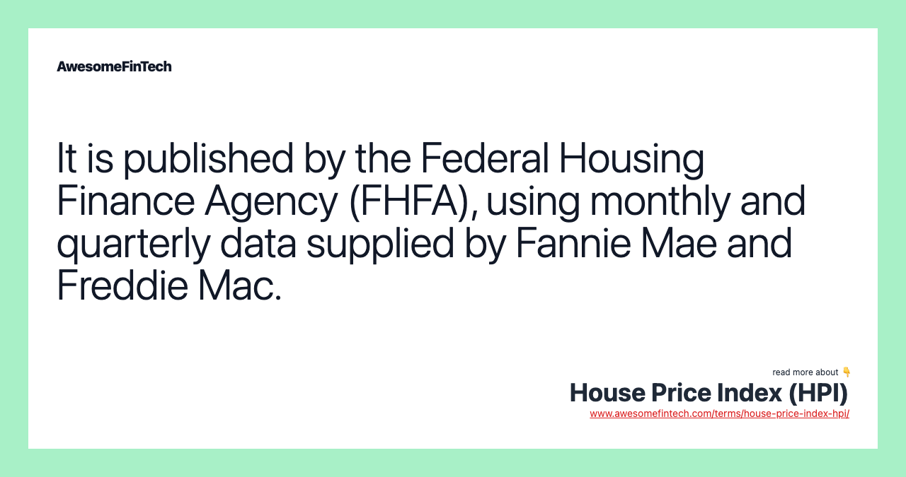The House Price Index (HPI) is a broad measure of the movement of single-family property prices in the United States. The HPI is pieced together by the Federal Housing Finance Agency (FHFA), using data supplied by the Federal National Mortgage Association (FNMA), typically known as Fannie Mae, and the Federal Home Loan Mortgage Corp. (FHLMC), commonly known as Freddie Mac. Data is compiled by reviewing mortgages purchased or securitized by Fannie Mae and Freddie Mac. The HPI is based on transactions involving conventional and conforming mortgages on single-family properties. It is a weighted repeat sales index, measuring average price changes in repeat sales or refinancings on the same properties. A HPI report is published every quarter, although a monthly report has also been published regularly since March 2008. The HPI is one of many economic indicators that investors use to keep a pulse on broader economic trends and potential shifts in the stock market. The rise and fall of house prices can have big implications for the economy. As already mentioned, the HPI measures average price changes for homes that are sold or refinanced by looking at mortgages purchased or secured by Fannie Mae or Freddie Mac. It is published by the Federal Housing Finance Agency (FHFA), using monthly and quarterly data supplied by Fannie Mae and Freddie Mac.