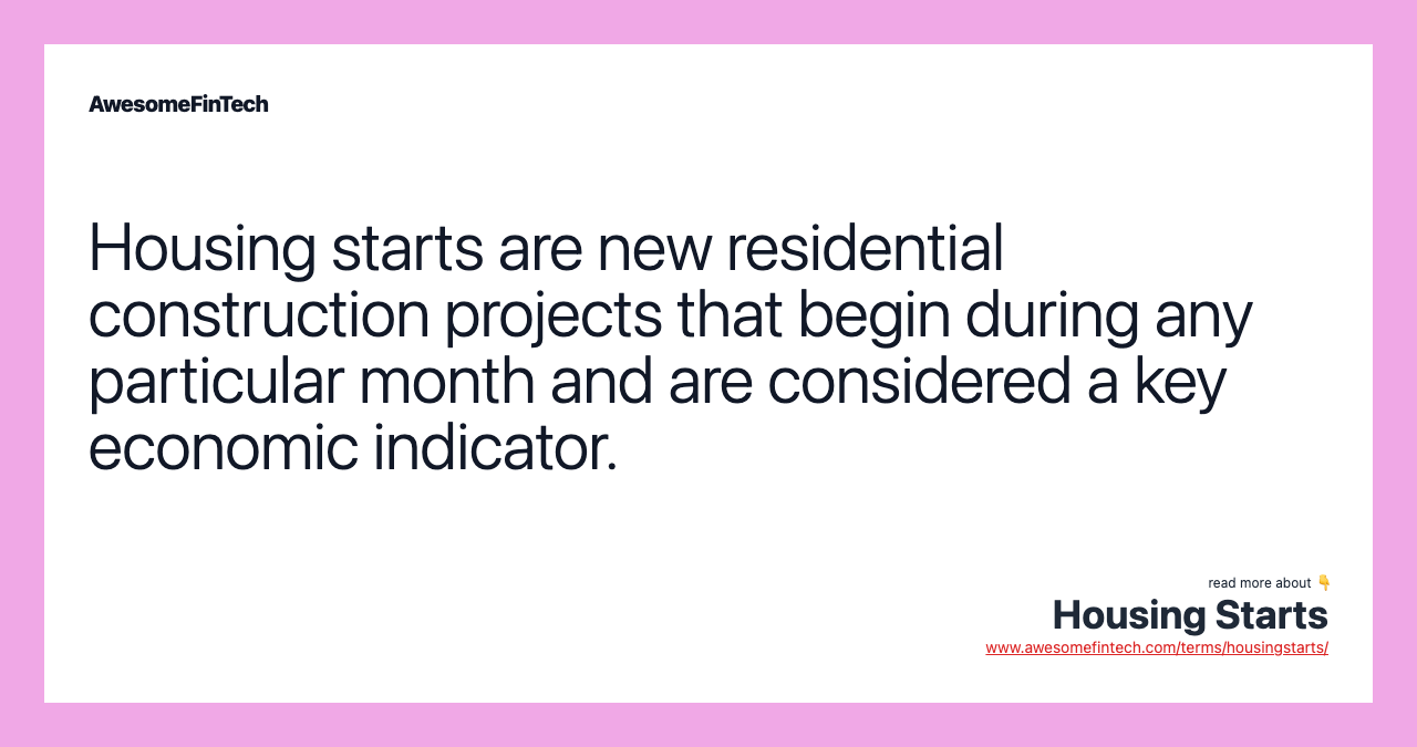 The term housing starts refers to the number of new residential construction projects that begin during any particular month. As such, it is a key economic indicator. Housing start statistics are released on or around the 17th of each month by the U.S. Commerce Department.