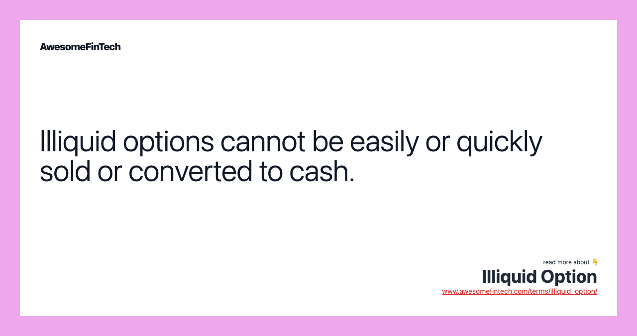 An illiquid option is an options contract that cannot be easily sold or converted to cash quickly at the prevailing market price. Illiquid options have very low or no open interest.