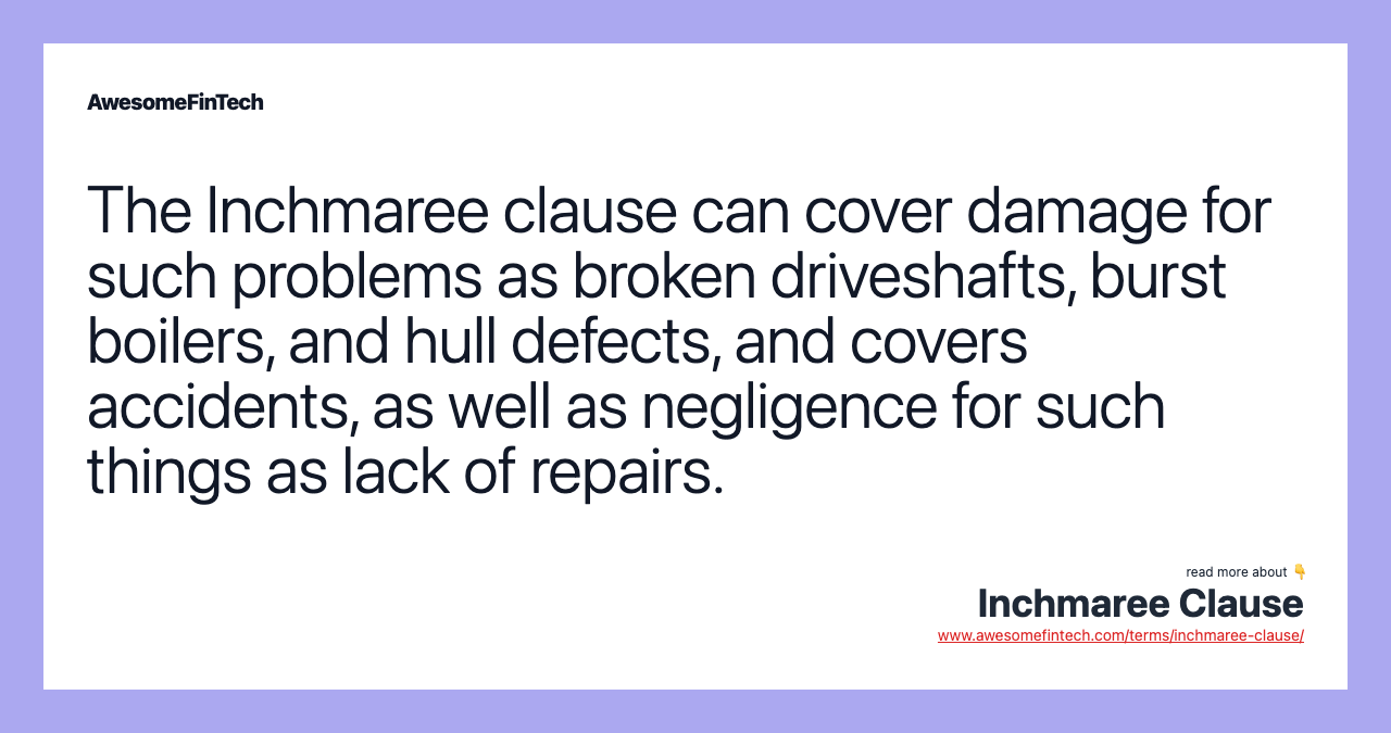 An Inchmaree clause is found in maritime insurance policies and provides coverage for the ship’s hull from loss or damage caused by machinery. The Inchmaree clause, also called the negligence clause, covers damage that is caused by the negligence of ship personnel, such as engineers and captains, when navigating. It is a type of additional perils clause.