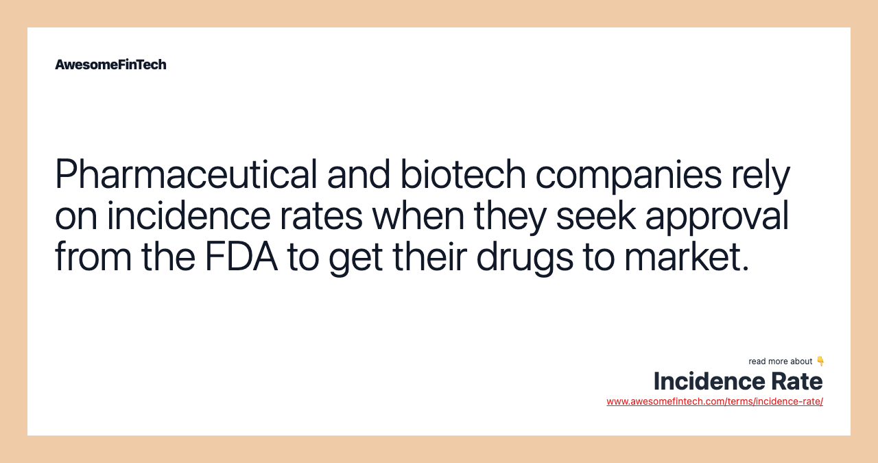 Incidence rates are commonly used by the Food and Drug Administration (FDA) to determine if and when pharmaceutical companies are allowed to take their drugs to market. In order to do so, these companies are required to conduct clinical trials (over a series of phases) and apply for FDA clearance to determine the efficacy of their drugs.