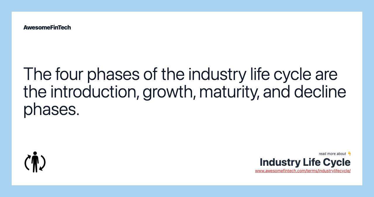 The industry life cycle refers to the evolution of an industry or business through four stages based on the business characteristics commonly displayed in each phase. The industry life cycle ends with the decline phase, a period when the industry or business is unable to sustain growth. The industry life cycle refers to the evolution of an industry or business based on its stages of growth and decline. The industry life cycle refers to the evolution of an industry or business through four stages based on the business characteristics commonly displayed in each phase. The four phases of an industry life cycle are the introduction, growth, maturity, and decline stages.
