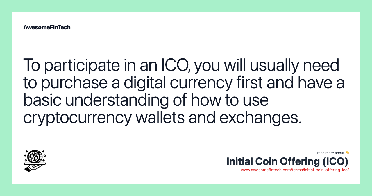 Investors looking to buy into ICOs should first familiarize themselves with the cryptocurrency space more broadly. In the case of most ICOs, investors must purchase tokens with pre-existing cryptocurrencies. This means that an ICO investor will need to already have a cryptocurrency wallet set up for a currency like bitcoin or ethereum, as well as having a wallet capable of holding whichever token or currency they want to purchase.