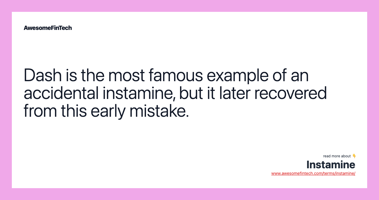 Perhaps the most famous case of instamining took place following the launch of Dash. The algorithms responsible for adjusting the mining difficulty for Dash did not work as planned. As a result, about 2 million coins were issued in the two days following the cryptocurrency's launch. Two million coins accounted for roughly 15% of the total Dash supply to ever be issued.
