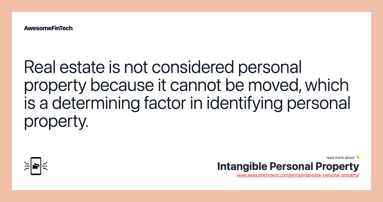 Intangible personal property is an item of individual value that cannot be touched or held. Some examples of intangible personal property include image, social, and reputational capital, and recently, personal social media pages and other personal digital assets. Real estate is not considered personal property because it cannot be moved, which is a determining factor in identifying personal property. Real estate is not considered personal property because it cannot be moved, which is a determining factor in identifying personal property. Intellectual property is one of the most common forms of intangible personal property.