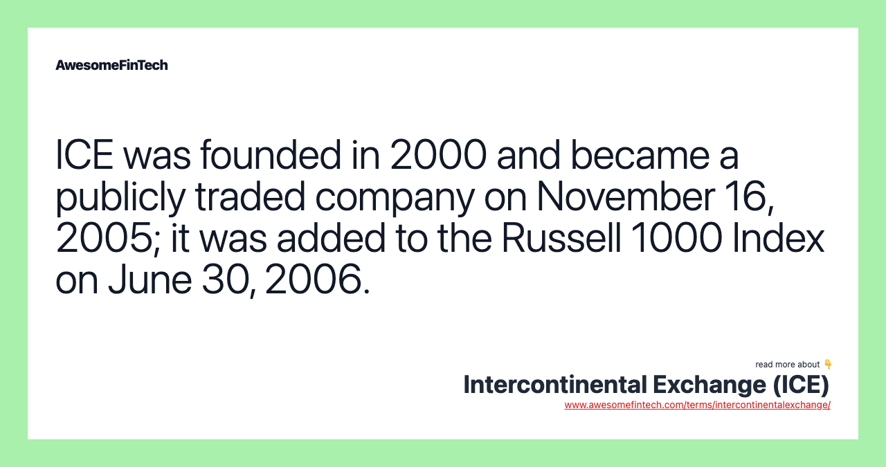 ICE became a publicly traded company on November 16, 2005, and was added to the Russell 1000 Index on June 30, 2006.