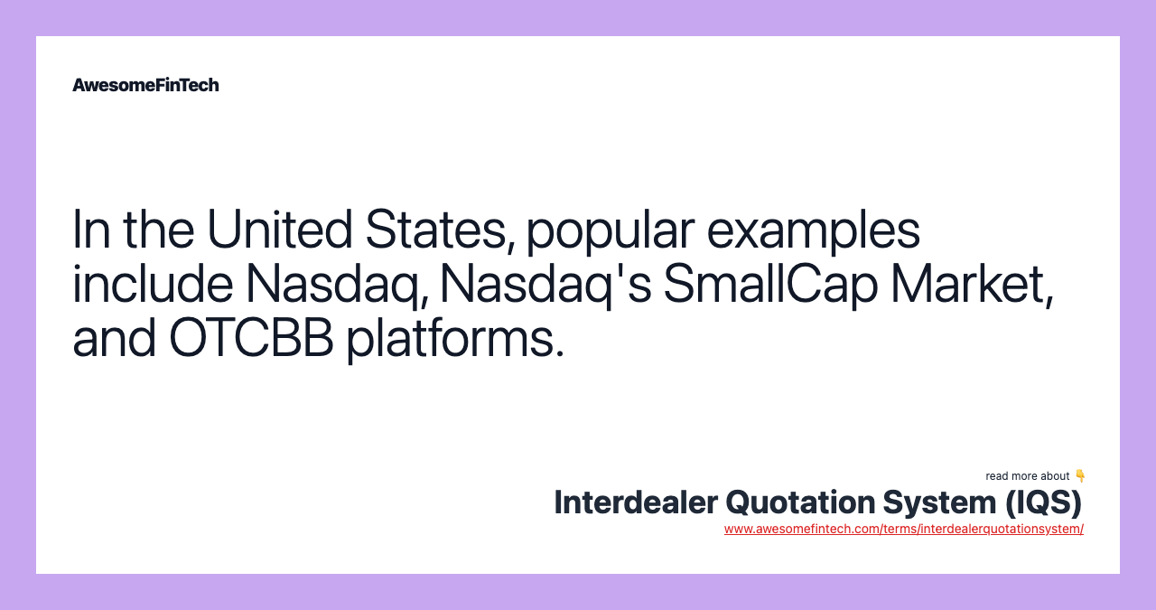 In the United States, the National Association of Securities Dealers Automatic Quotation (Nasdaq), Nasdaq SmallCap Market, and the Over-The-Counter Bulletin Board (OTCBB) exchange platforms are integrated into one IQS. By using this integrated system, investors have access to a wide range of securities, ranging from large blue-chip companies to smaller micro-caps.