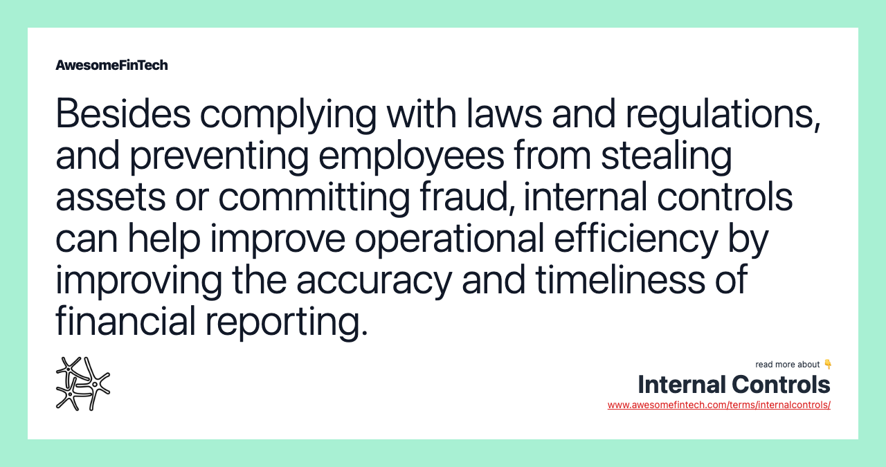 Besides complying with laws and regulations and preventing employees from stealing assets or committing fraud, internal controls can help improve operational efficiency by improving the accuracy and timeliness of financial reporting.