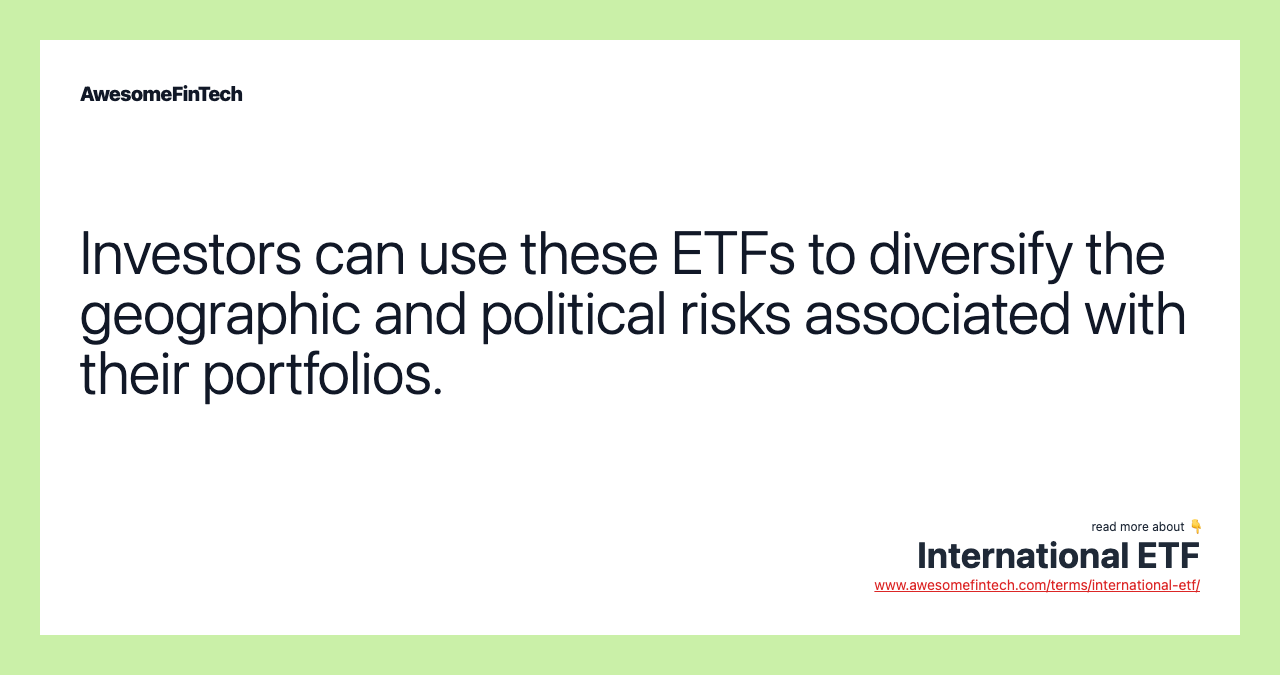 An international exchange traded fund (ETF) is any ETF that invests specifically in foreign-based securities. The focus may be global, regional, or on a specific country and may hold equities or fixed-income securities.